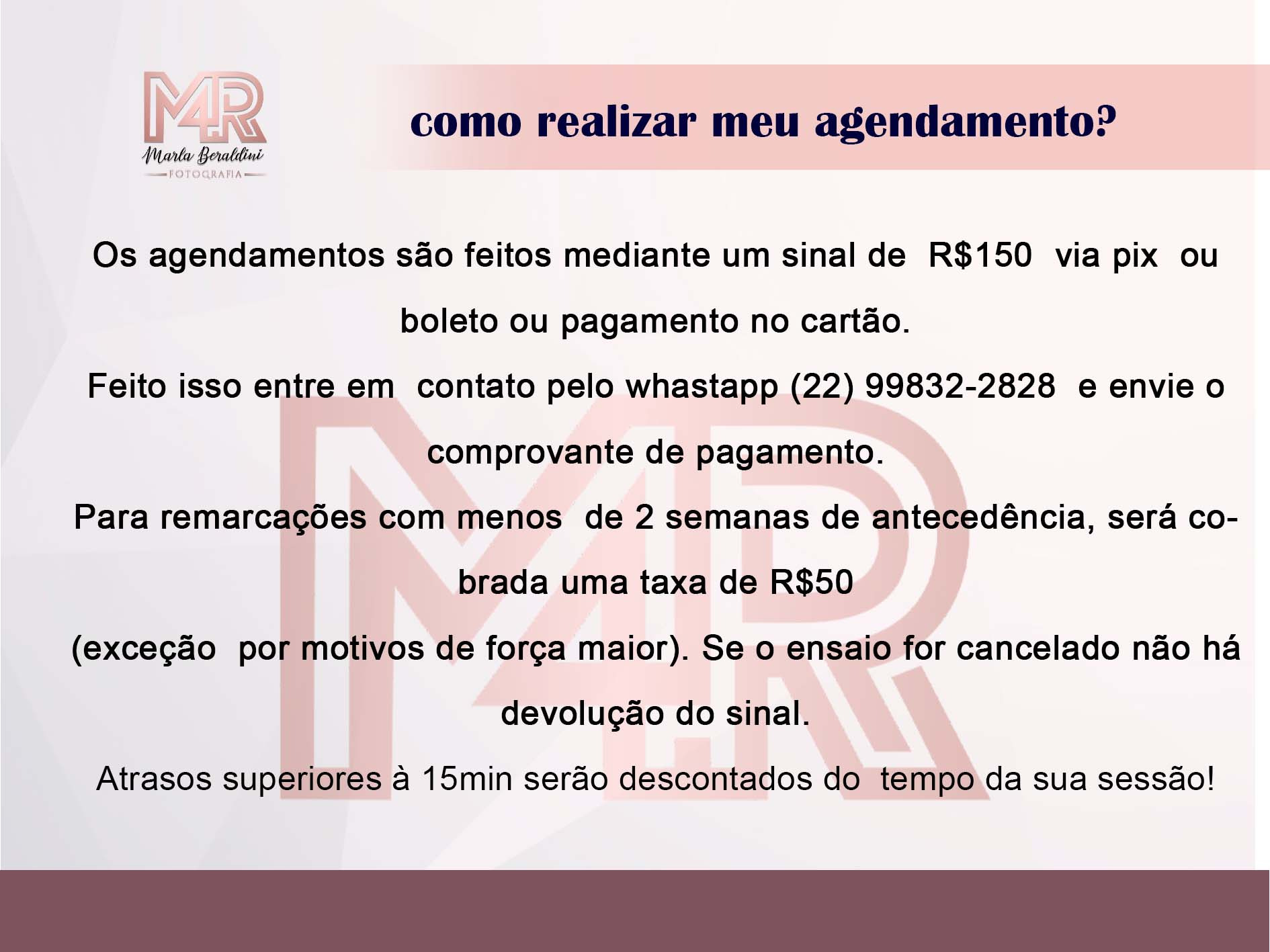 Para remarcações com menos de 2 semanas de antecedência, será cobrada uma taxa de 150 reais (exceção por motivos de força maior). Se o ensaio for cancelado não há devolução do sinal.